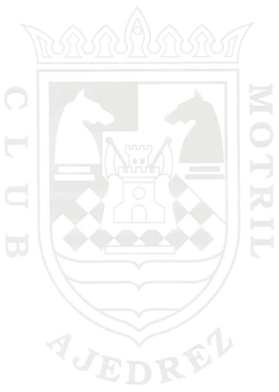 LUGAR DE JUEGO: PABELLÓN CUBIERTO DE MOTRIL (GRANADA). SISTEMA DE COMPETICIÓN: SUIZO 7 RONDAS. RITMO DE JUEGO: 15 minutos “finish” por jugador. SISTEMAS DE DESEMPATE: 1º Buchholz (-2). 2º Progresivo. 3º BuchHolz mediano (-1). INSCRIPCIÓN: ABIERTA Y GRATUITA. Hasta las 15:00 H. del día 2 de Diciembre de 2006. Los inscritos posteriormente se incorporarán en la segunda ronda. A la dirección de correo electrónico: torneos@clubajedrezmotril.com A los teléfonos móviles 616-739-884; 616-440-785. ENTREGA DE PREMIOS: A LAS 14:00 HORAS EN LA SALA DE JUEGO. ÁRBITRO DEL TORNEO: SERGIO CUESTA BUSTOS. DIRECTOR DEL TORNEO: SERAFIN GARCIA ORTEGA. PATROCINAN: ÁREA DEPORTES AYUNTAMIENTO MOTRIL Y ESPACIO 2005 COLABORAN: CROISSANTERIA “EL PINAR” ,DISTRIBUCIONES CAÑADÚ,“DYNOS” INFORMÁTICA Y ESCUELA GRANADINA DE AJEDREZ “EGA”. ORGANIZA: CLUB AJEDREZ MOTRIL. CATEGORÍAS: Categoría, CADETE Nacidos en los años 1990 y 1991 Categoría, INFANTIL “ “ “ “ 1992 y 1993 Categoría, ALEVÍN “ “ “ “ 1994 y 1995 Categoría, BENJAMÍN “ “ “ “ 1996 y 1997Categoría, PREBENJAMÍN “ del año 1998 en adelante. SE JUGARÁN DOS TORNEOS, DISTINTOS, AL MISMO TIEMPO: TORNEO A: CATEGORÍAS CADETE, INFANTIL Y ALEVÍN. TORNEO B: CATEGORÍAS BENJAMÍN Y PREBENJAMÍN. PREMIOS: 1º CLASIFICADO DE CADA CATEGORÍA:...............TROFEO + 30 €.( en material de ajedrez) 2º CLASIFICADO DE CADA CATEGORÍA:...............TROFEO + 20 €.( en material de ajedrez) 3º CLASIFICADO DE CADA CATEGORÍA:...............TROFEO + 15 €.( en material de ajedrez) 4º,5º,6º,7º,8º,9º y 10º DE CLASIFICADO DE CADA CATEGORÍA:...........................TROFEO