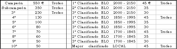 13. REPARTO DE PREMIOS: los premios en metálico se adjudicarán por riguroso orden de clasificación, es decir, NO se repartirán entre los jugadores con igualdad de puntuación. Los premios NO son ACUMULATIVOS. Los tramos de elo se basarán primero en el FIDE, seguido del FCE y por último el FEDA o nacional.