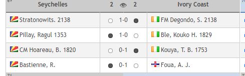 Por otro lado, hoy la noticia ha saltado en el tablero 86 de la categoría Open. La República Centro Africana ha conseguido la primera victoria de su historia olímpica y, evidentemente, con victoria del amigo Cedric que ha vuelto a ganar ! Lleva 2.5 de 4 y es oficialmente el killer de su selección. Soy fan de Cedric Ngackossi-Nogoulaka ! La victoria ha sido sobre las Islas Seychelles por 2.5 - 1.5.