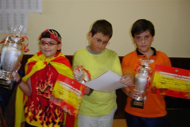 El podium sub-10 Segunda posición para el valenciano David Pardo que también termina el torneo invicto y que fue el único capaz de frenar al nuevo campeón. La tercera plaza para el andaluz Antonio Pintor. En féminas otra andaluza Amalia Aranaz se lleva la medalla de oro, después de amarrar una tablas con relativa rapidez en la ultima ronda, la verdad es que ha dominado el torneo en su categoría, llegando a jugar en los primeros tableros. la de plata para la jugadora del Banyoles Julia Muratet, miembro de una saga del Ajedrez catalán tercera plaza para la madrileña Maria Cerrato