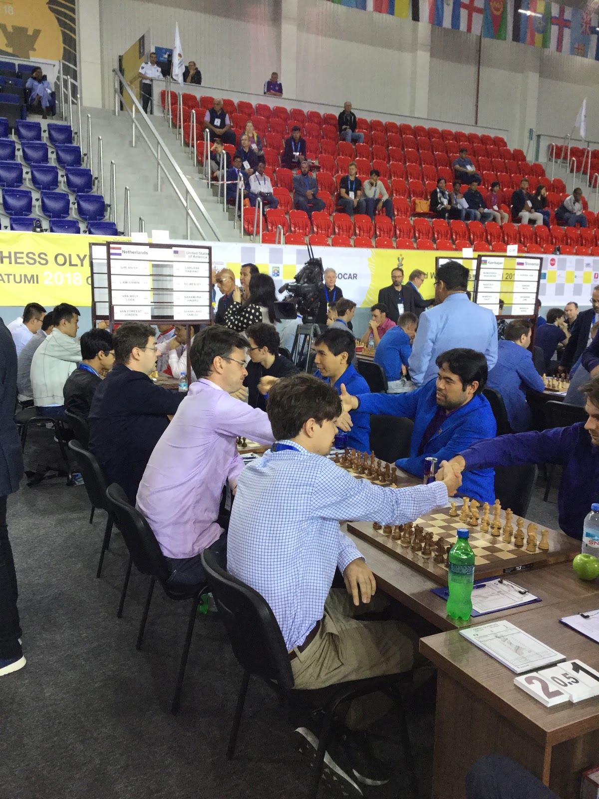 Esta tarde nos hemos podido acreditar como prensa en la Olímpiada. Estas nos ha dado acceso a muchas de las zonas comunes y hemos podido abandonar las áridas gradas de ayer, que hoy continuaban igual de áridas que ayer. Es difícil de entender que un país con la tradición ajedrecística de Georgia, con campeonas del Mundo que son veneradas en su país, y en una ciudad como Batumi con mas de 100.000 habitantes, no se consiga atraer publico a pesar de ser la entrada gratuita. Ayer tuvimos la posibilidad de comentarlo con el actual presidente y candidato Georgios Makropoulos, que nos dio la razón. Algo no se ha hecho bien en la publicidad de la Olimpiada entre los aficionados georgianos. No hemos podido pisar la arena, ya que cuando hemos recibido las acreditaciones la ronda ya estaba en marcha y la prensa tiene restringido su acceso hasta algunos minutos después de su inicio. En cuanto a resultados destacar que aunque sea un tópico, no hay enemigo pequeño, y ya en estas primeras rondas algunos ilustres del tablero no se han podido adjudicar el punto, como Caruana o Karjakin que se han tenido que conforma con tablas con jugadores a los que les sacaba algunos cientos de puntos de elo. Aunque la mayoría de selecciones favoritas se han adjudicado el punto del match. Las excepciones Hungría, que no ha pasado del empate ante Albania y los anfitriones que han empatado con una Noruega sin el campeón del Mundo. España se ha impuesto a la Republica Dominicana por 3'5 a 0'5 y el femenino ha conseguido una victoria por la mínima ante Bangladesh. La anecdota de la Olímpida ha sido que el periodista indio Nikles Jain, antes de empezar la segunda ronda le ha pedido matrimonio a la jugadora colombiana WGM Angela Franco, que le ha dicho que si, los os se conocieron este verano en Barcelona cuando participaban en el Circuit Català, Los indios por lo visto no solo venían a por el elo.